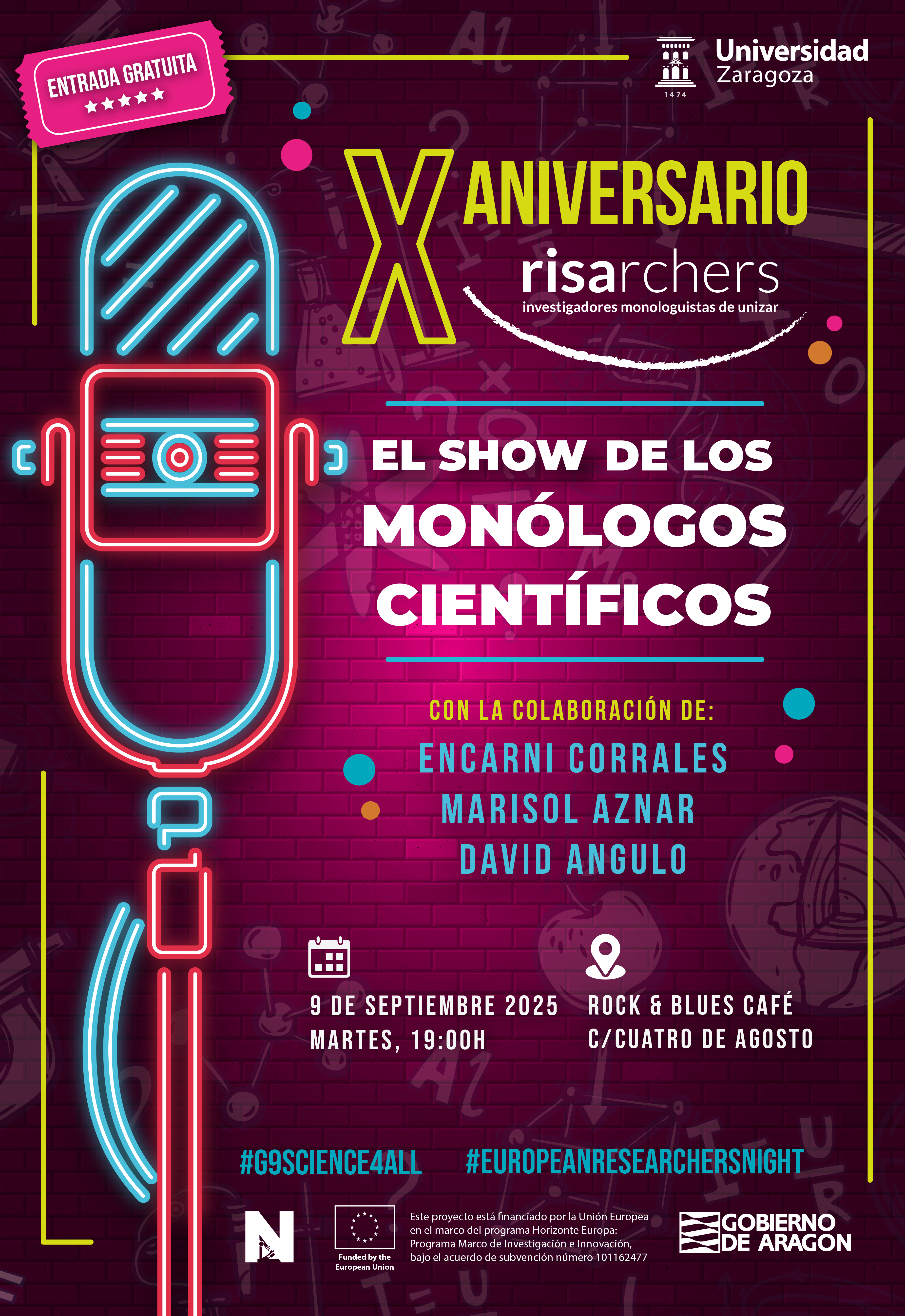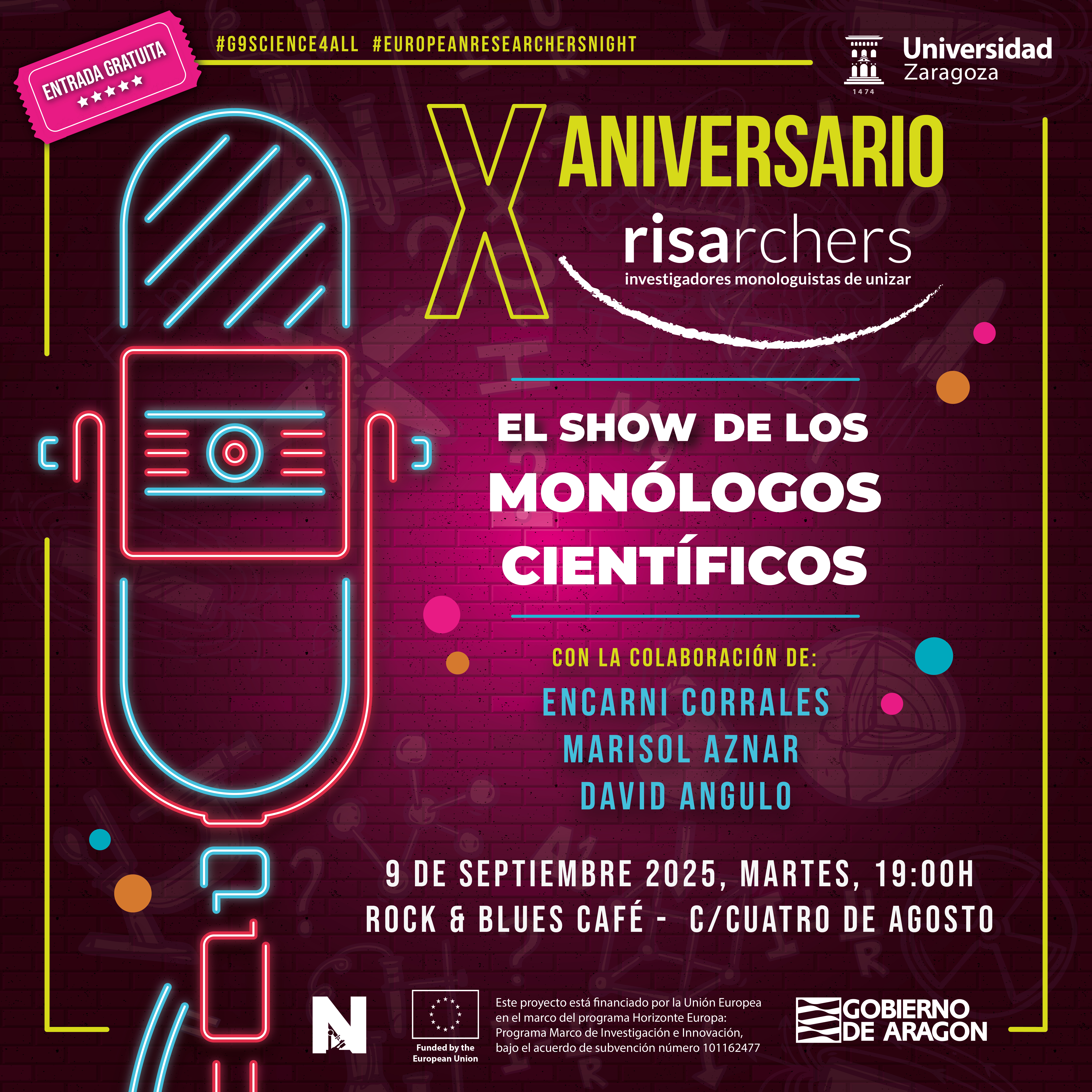 (Zaragoza, lunes 8 de septiembre de 2025). El grupo RISArchers, formado por investigadoras e investigadores monologuistas de la Universidad de Zaragoza, cumple una década acercando la ciencia al público a golpe de risa y talento escénico. Para celebrarlo, mañana martes 9 de septiembre a las 19.00 horas, el bar Rock and Blues Café de Zaragoza acogerá una gala festivo-científica, conducida por los maestros del humor aragonés Encarni Corrales, Marisol Aznar y David Angulo.